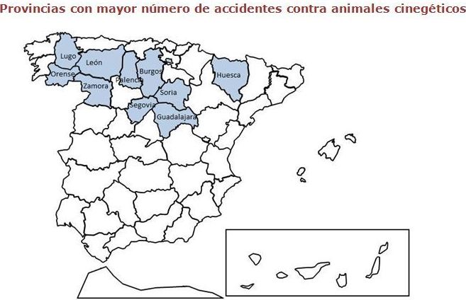 El informe elabora también un ranking con las 10 provincias en las que más riesgo hay de sufrir un accidente de tráfico con un animal de caza. La lista que encabezan Soria, Burgos y Guadalajara muestra que es en la mitad norte de España donde más siniestros de este tipo se registran.