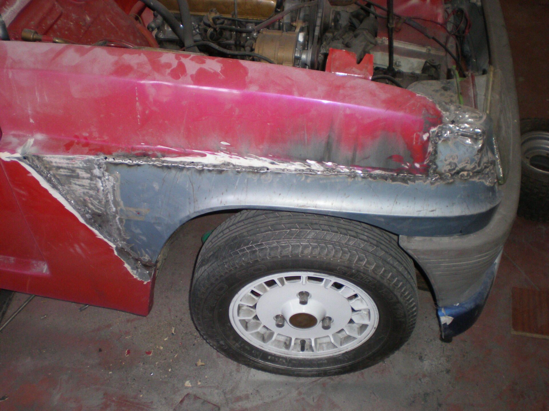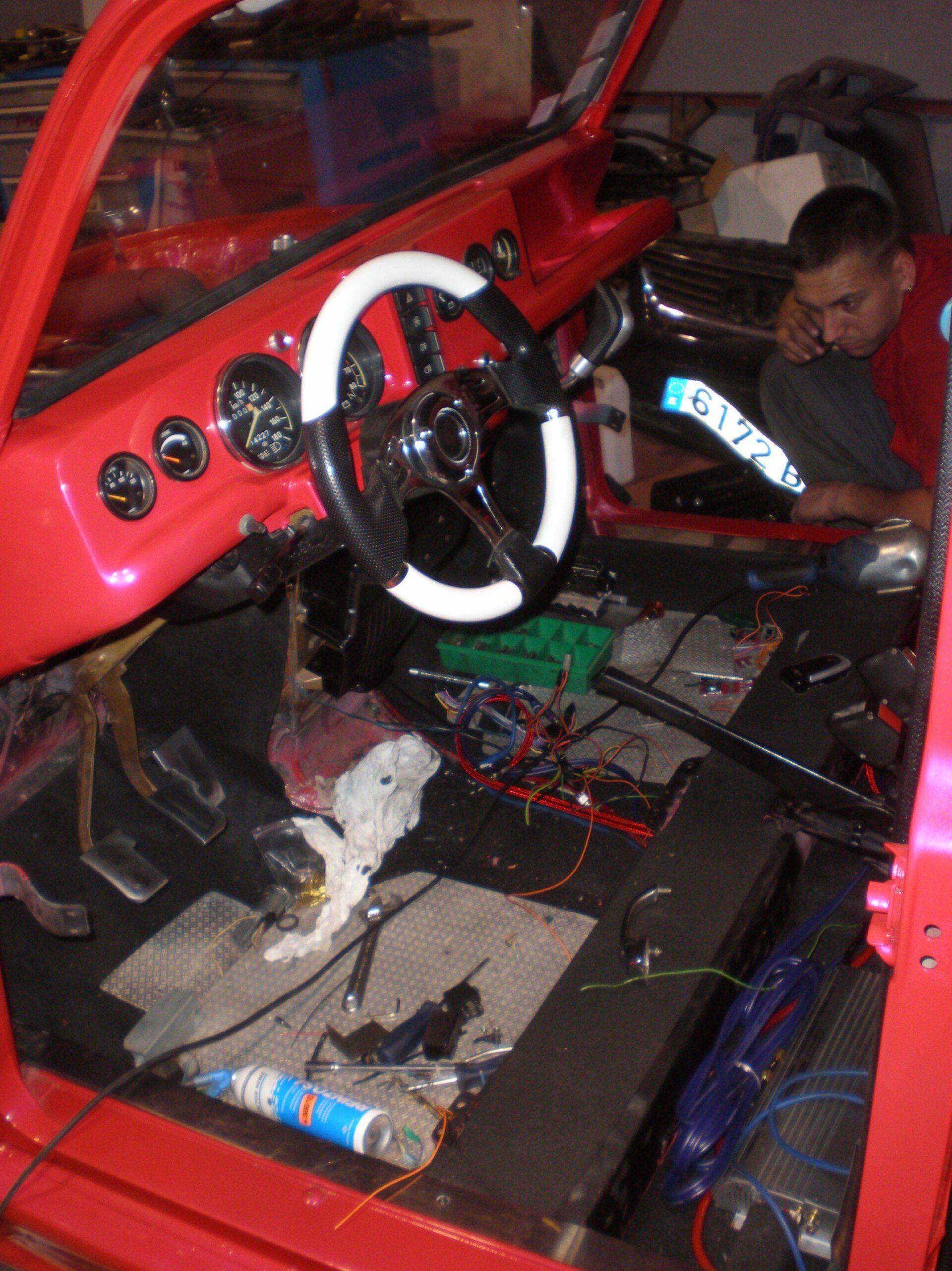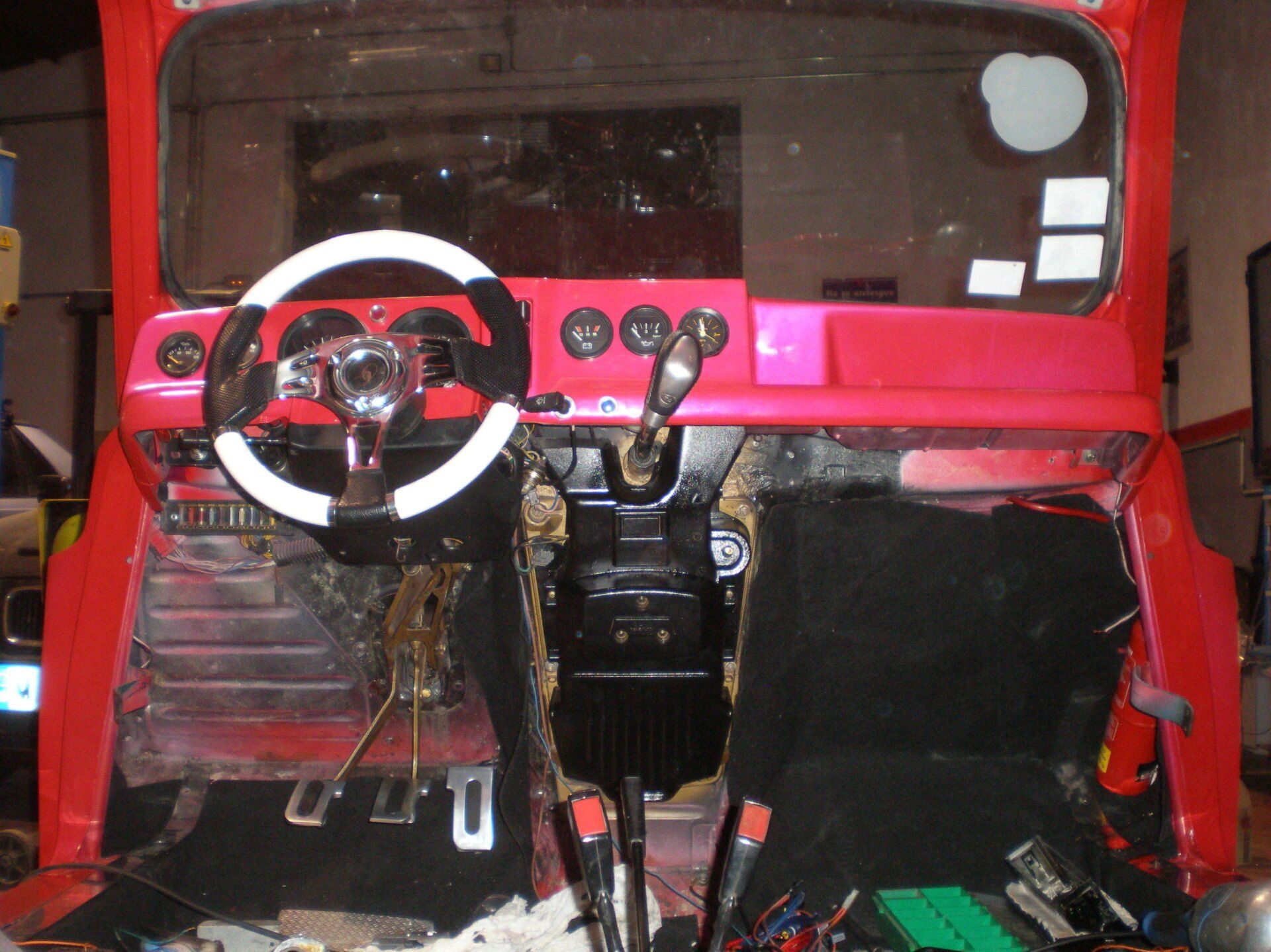 Aun así, la inquietud por mejorar las expectativas, hizo que nos embarcáramos en otra nueva apasionante aventura. Esta vez, seria una modificación de trascendencia. Gracias a la ayuda del equipo de A. Franjor, nos pusimos a ello. Instalando paragolpes delantero, taloneras y aletines laterales artesanales. Todo el trabajo, fue realizado en material de chapa, alisamos el porto trasero, eliminando de paragolpes trasero, los pilotos traseros los desplazamos a la parte superior. Reemplazamos la placa de matrícula delantera por una de dimensiones 340x110 mm, Sustituimos de neumáticos y llantas por 185/60 R13 80H y 6jx13”, montamos en las ruedas separadores de 40 mm. Variando las dimensiones: vía anterior/posterior: 1330/1340 mm. anchura: 1530 mm. Tara: 890 Kg. Realizamos una innovación en el interior, tapizamos los asientos, personalizándolos, cambiamos el volante por uno más deportivo, el frontal del salpicadero se modernizo conservand